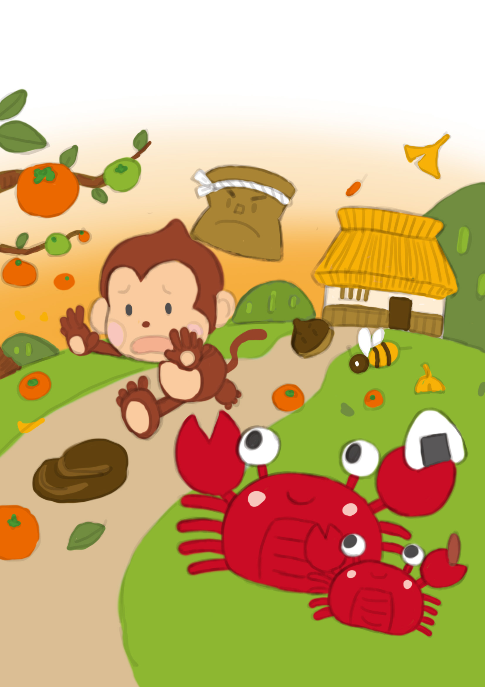 テーマは「仲間と協力して困難を乗りこえる」。柿の木の下で猿をこらしめる名シーンを、低学年の子どもたちが楽しめるように、ユーモアを重視した構成で再現しています。カニの親子、猿、うす、牛のくそ、くり、ハチ――それぞれのキャラクターが生き生きと登場し、空中を飛ぶうすやハチの動きが紙面全体にリズムを生み出しています。全体は絵本のワンシーンのような明るい構図で、物語の流れと感情がひと目で伝わるデザインになっています。