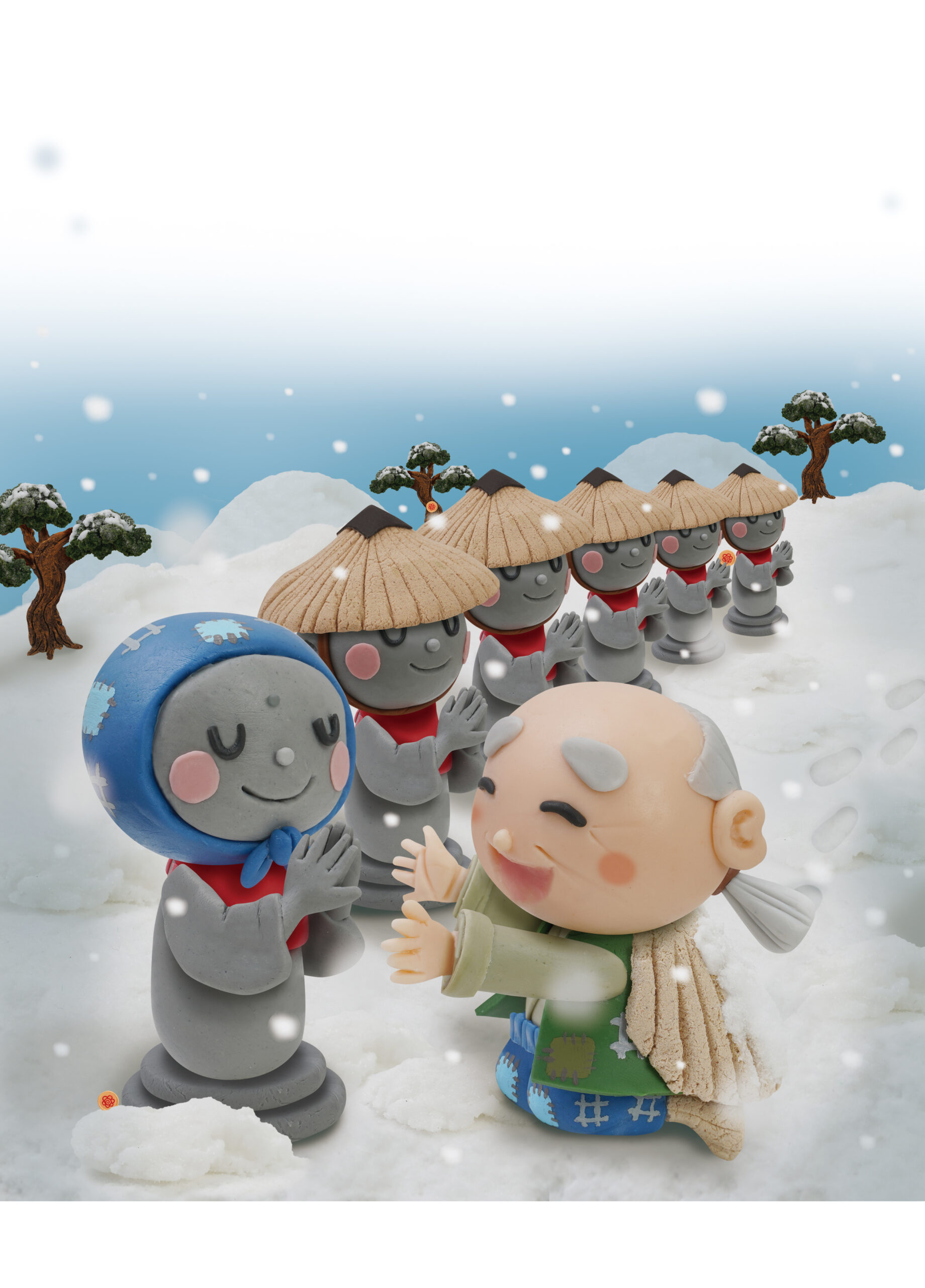 テーマは「思いやりと感謝の心」。雪の降る夜、お地蔵さんの頭が寒かろうと売れ残った傘をかぶせてあげるおじいさん。最後のお地蔵さんには傘がなく、自分のほっかむりをかぶせてあげる――そのやさしさの瞬間を、物語の情緒そのままに立体化しました。誌面中央にはおじいさんとお地蔵さんが柔らかな光の中で向かい合う構図を配置。周囲の静かな雪景色とのコントラストで、冬の夜に灯る“心のあかり”を感じさせるビジュアルデザインとなっています。