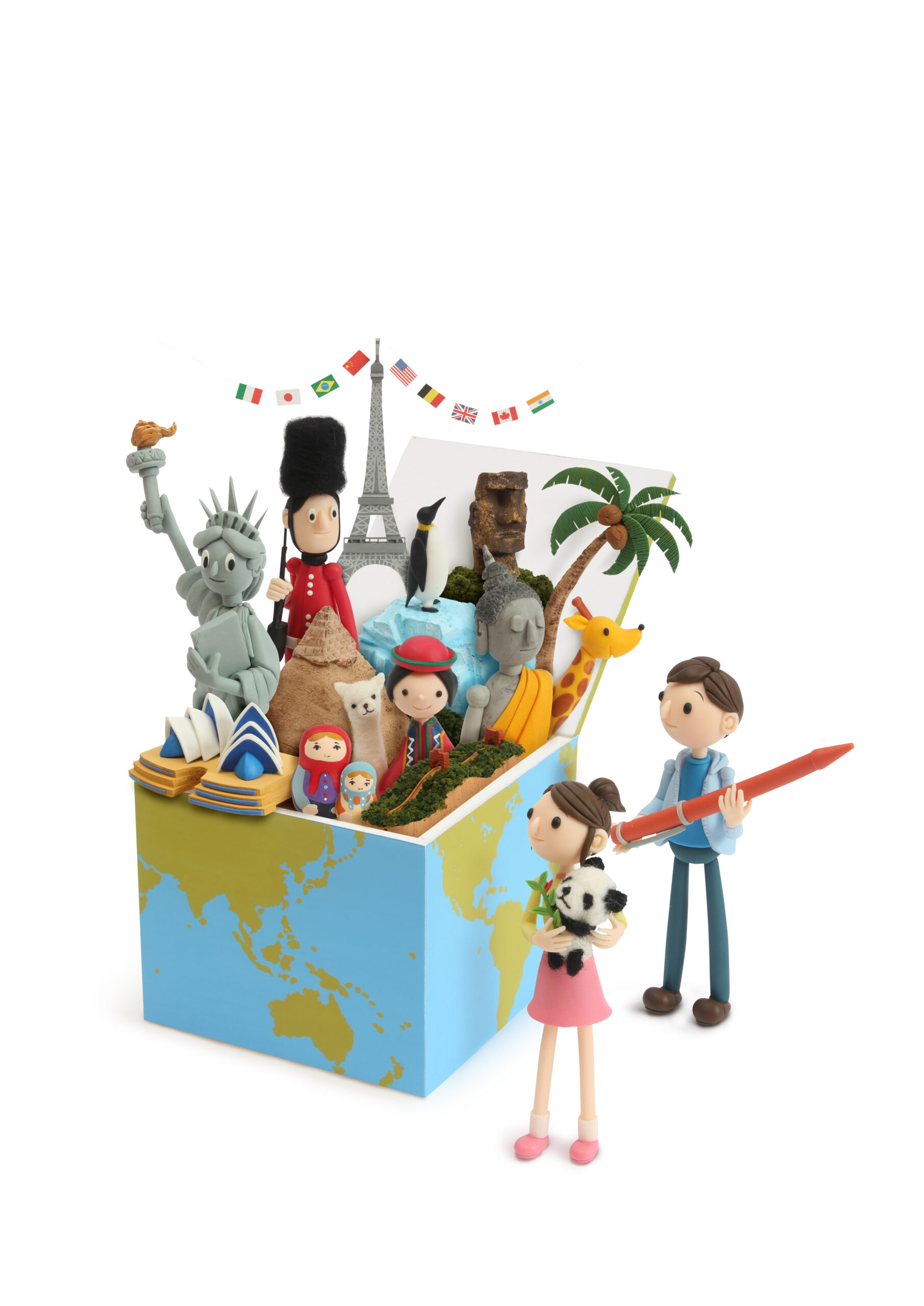 各国モチーフやキャラクターは樹脂粘土・軽量粘土・スチロール・スポンジ・羊毛フェルトなど複数素材を組み合わせて制作。男女の中学生キャラクターは、男の子が樹脂粘土製の大きなボールペンを持ち、女の子は羊毛フェルトで作られたパンダを抱える構成。中学生というターゲット層に合わせ、可愛すぎず、モチーフの意味が一目で分かる適度なデフォルメバランスを追求しました。ウォルナッツ・クレイワークスタジオが得意とする“年齢層ごとの造形設計”が光る一作です。