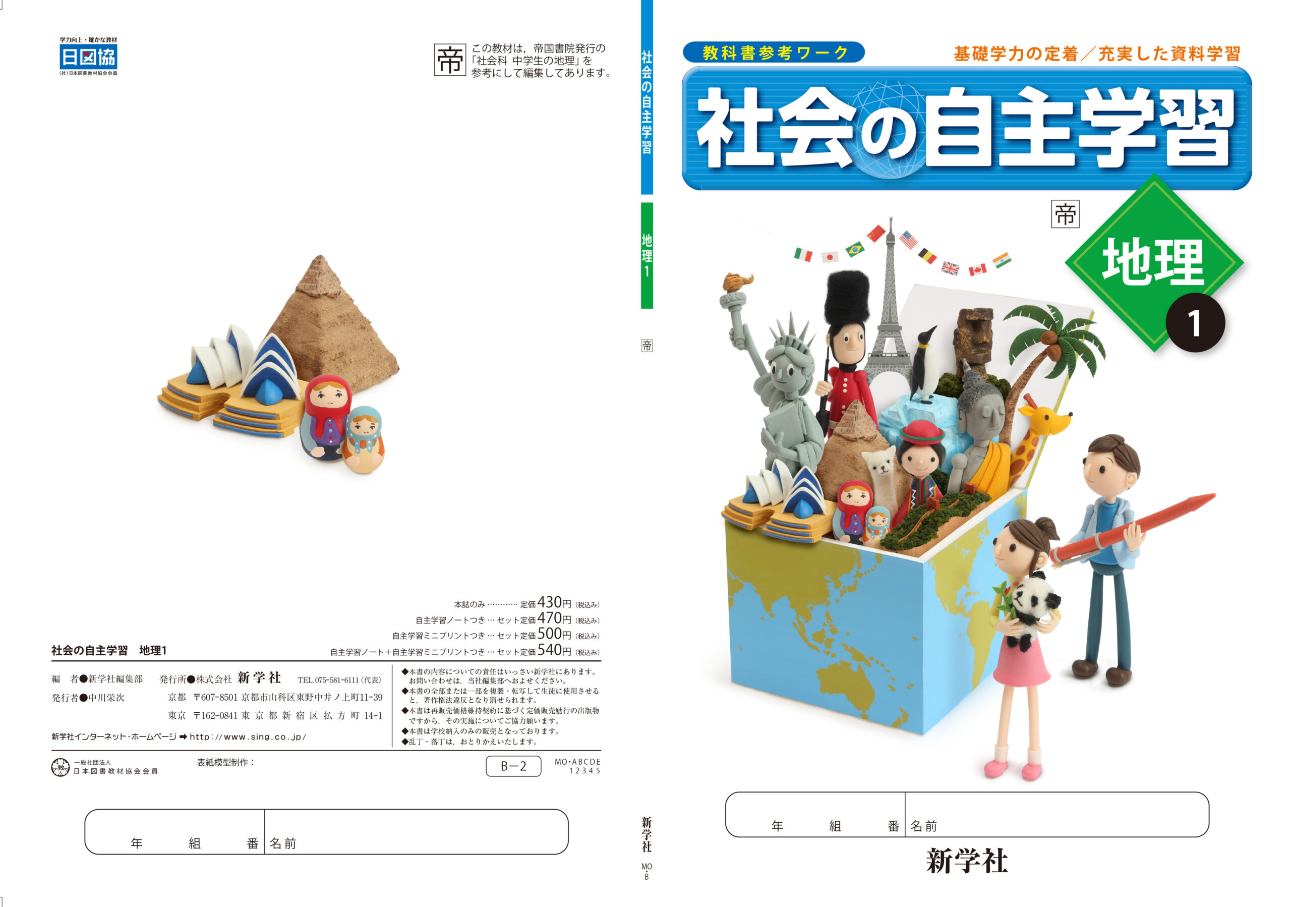 中学生向け社会科教材『社会の自主学習 地理1』(新学社)の表紙用クレイアートビジュアルを制作しました。ウォルナッツ・クレイワークスタジオが企画デザインから立体造形、撮影、DTP仕上げまで一貫して担当。“世界の地理を学ぶ楽しさ”をテーマに、地球のびっくり箱から飛び出すように各国の文化や象徴を造形で表現しています。