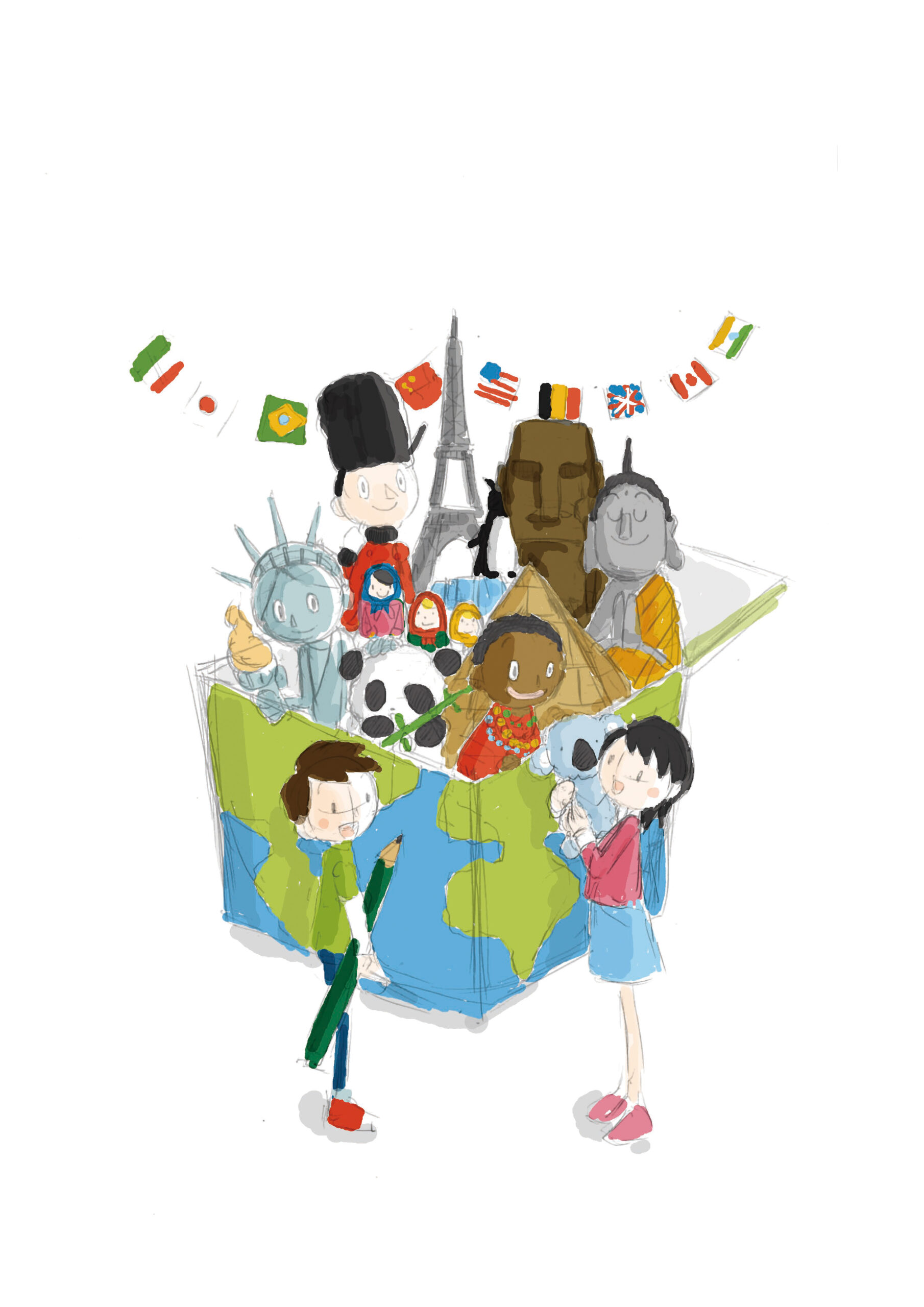 表紙の中心には「地球のびっくり箱」を配置。スチロールボードで制作した立方体の箱を、海と大陸を手描きで描いたアクリルガッシュ塗装により地球儀のようにデザインしました。そこから飛び出すモチーフとして、自由の女神(アメリカ)・オペラハウス(オーストラリア)・マトリョーシカ(ロシア)・万里の長城(中国)・ピラミッド(エジプト)・チベットの民族衣装を着た女の子とアルパカ・仏像(タイ)・キリン(アフリカ)・ヤシの木(南国)・モアイ像(イースター島)・南極のペンギン・エッフェル塔(フランス)と万国旗など、世界各地の文化的アイコンを精密に立体化しました。 ひとつひとつの造形が、地理の学びを“世界の縮図”として感じられる構成になっています。