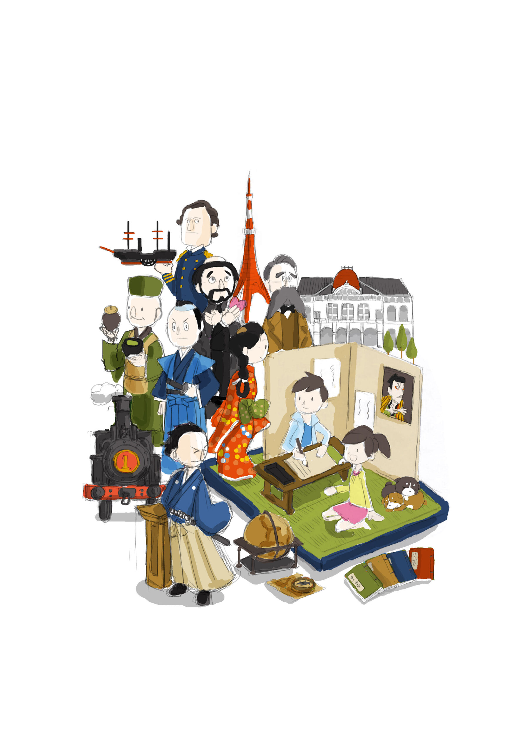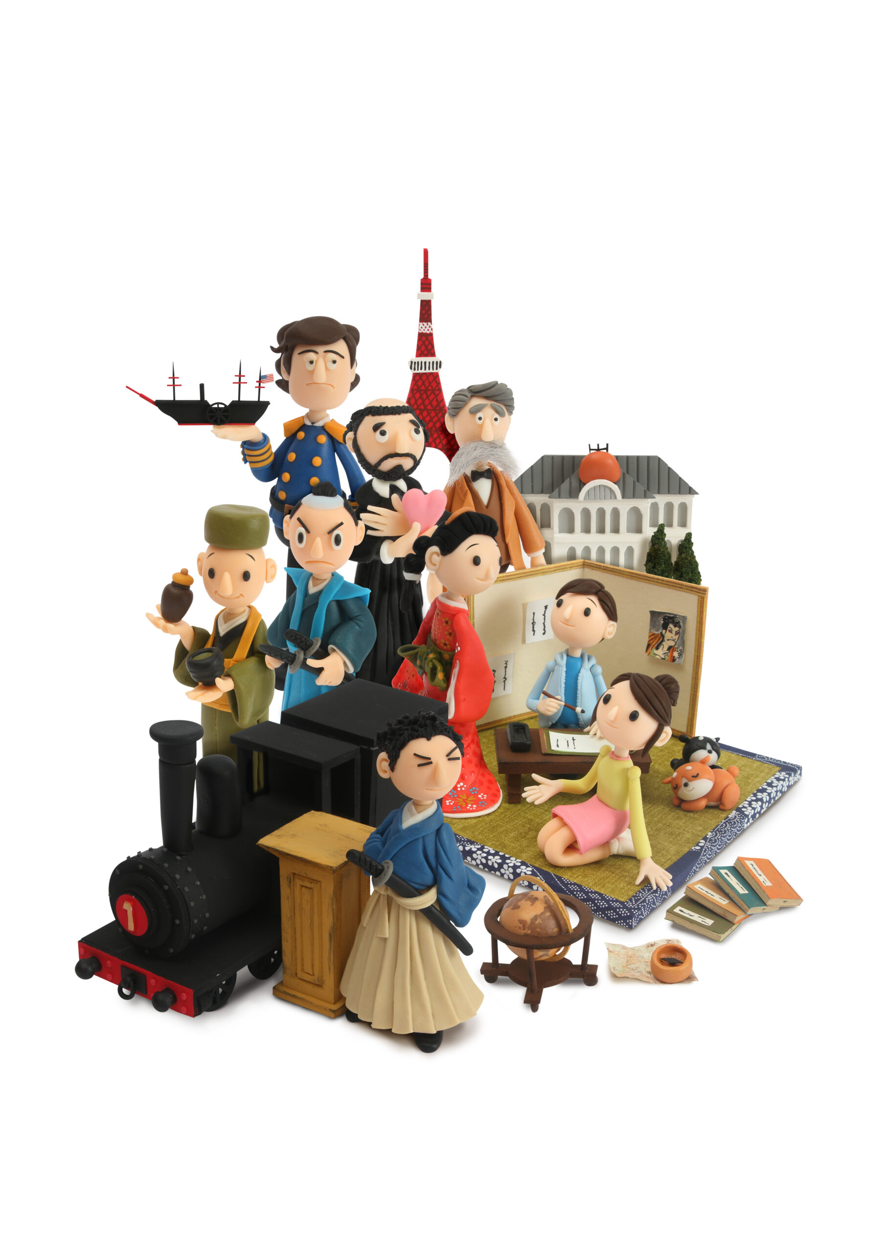 すべての造形を手作業によるクレイアートで制作。樹脂粘土、軽量粘土、スチロールボード、スポンジ、羊毛フェルト、和紙など多素材を組み合わせ、それぞれの時代にふさわしい質感・重量感・立体感を再現しています。背景要素には、蒸気機関車、地球儀、寺子屋の衝立、葛飾北斎の絵、迎賓館、東京タワーなどを配置。スチロールボードを芯材とし、樹脂粘土による装飾を重ねることで、半立体的な奥行き構造を実現しています。 畳は本物の井草を用い、書物や巻物は和紙を使用。墨のついた筆跡や書き込みまで再現し、“日本の学びの原点”である寺子屋の空気感を丁寧に造形しています。また、背景にはアクリルガッシュで描かれた葛飾北斎の絵が飾られており、アナログ手法でありながら絵画的要素と立体造形を融合させた、多層的なアート構成となっています。