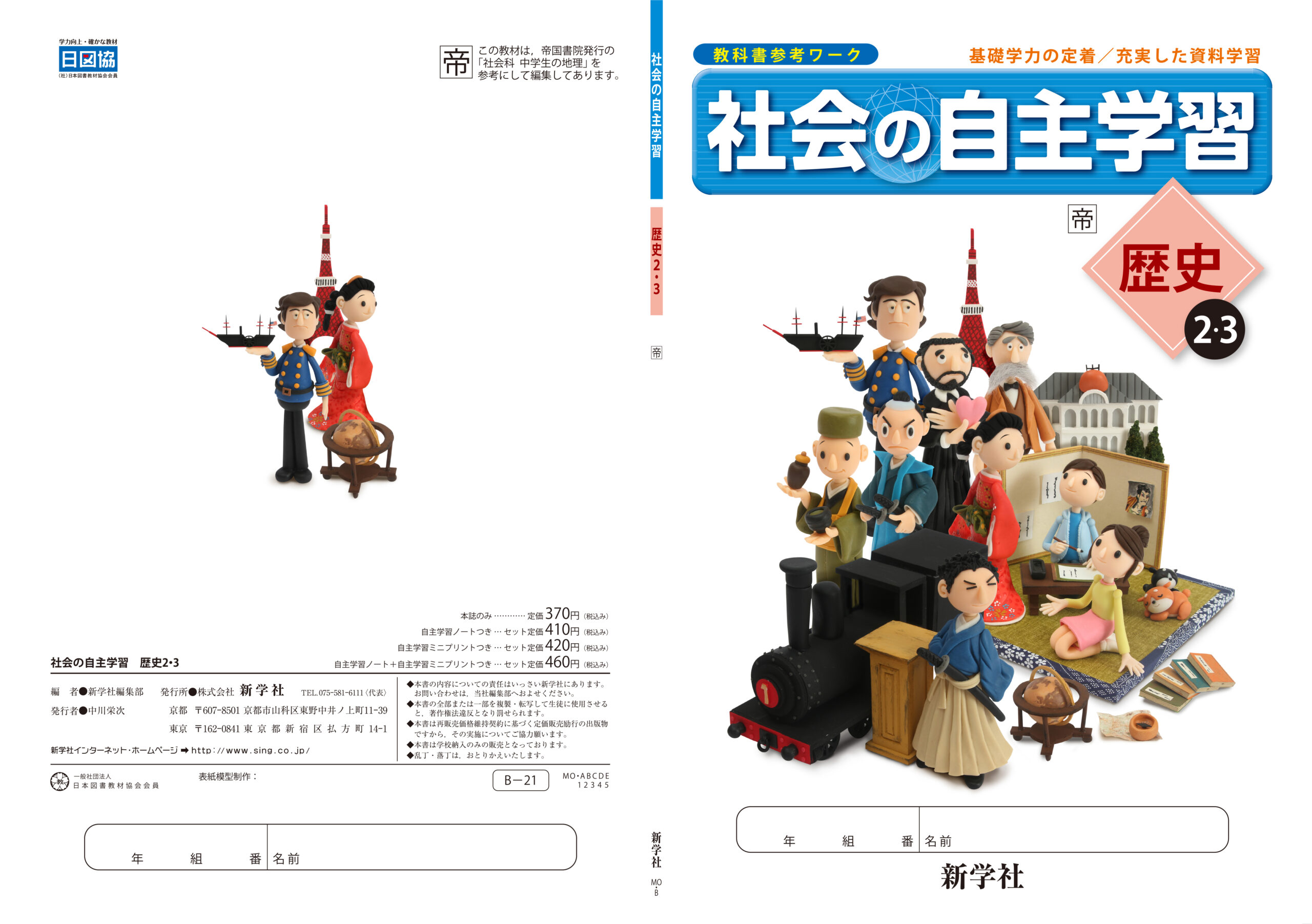 中学生向け社会科教材『社会の自主学習 歴史2』(新学社)の表紙用クレイアートビジュアルを制作しました。ウォルナッツ・クレイワークスタジオが企画デザインから立体造形、撮影、照明、DTP仕上げまで一貫して担当。 「戦国時代から近代までの歴史を、立体で体験するように学ぶ」をテーマに、それぞれの時代を象徴する人物・文化・技術・建築物を粘土造形によって表現した作品です。前作(歴史1)の“古代から鎌倉”に続く構成で、シリーズ全体を通して歴史の流れを立体的に感じるビジュアルデザインとなっています。