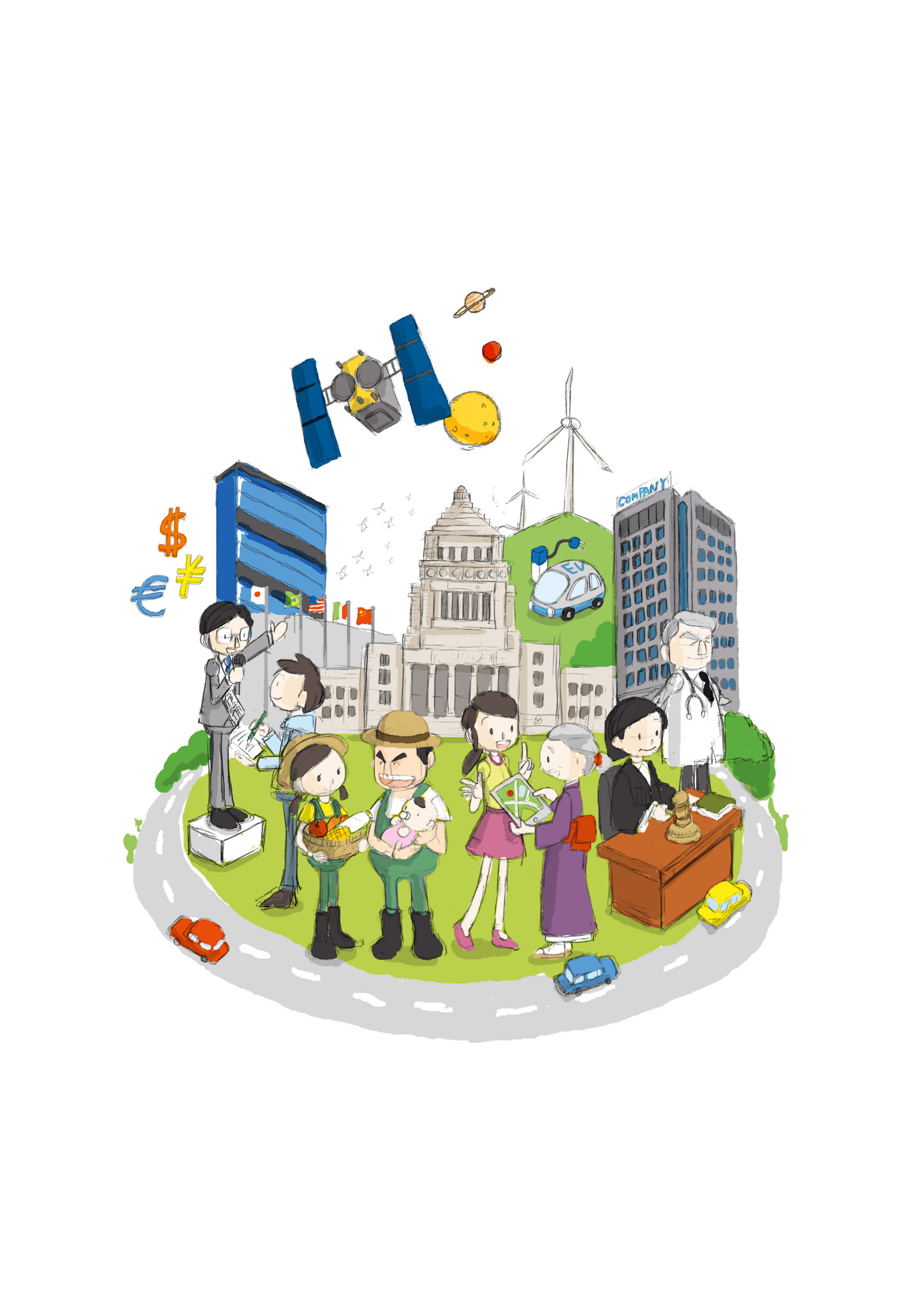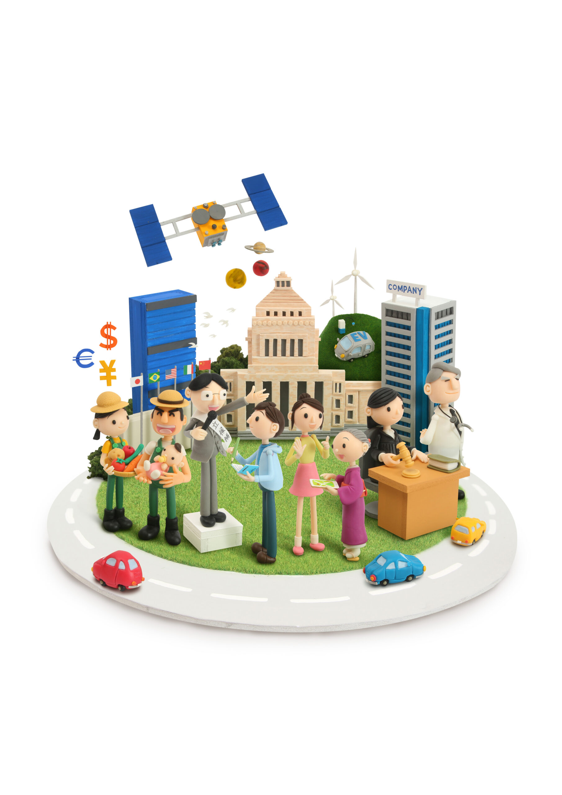 主要な造形物はすべて樹脂粘土・軽量粘土・スチロールボード・スポンジ・紙素材を組み合わせて制作。中央には社会を象徴する人々が配置され、周囲を走る道路や芝生エリアなどのインフラ要素が立体的に広がります。道路はスチロールボードを基盤に、車両は樹脂粘土で制作。人々が集うスペースにはミニチュア用の芝テクスチャを使用し、生活の息づかいを感じる構成にしました。登場人物もすべてハンドメイドのクレイアート。農家のキャラクターが手に持つりんご・じゃがいも・トマト・にんじんなどの野菜は、一つひとつ樹脂粘土で造形し、実際の質感や色味を丁寧に再現。赤ちゃんの造形では、おしゃぶりや抱かれた手の丸みまで細部を追求しています。政治家キャラクターは、樹脂粘土で制作した本体に紙製の立候補タスキを巻きつけ、「立候補」の文字を実際に手書きで書き入れるなど、現実の構造を忠実に再現。裁判官のガベルや書籍、医師の聴診器やカルテなど、 それぞれの職業を象徴する小物類もすべて樹脂粘土によるミニチュア制作で仕上げています。また、社会の未来を象徴する要素として、風力発電タービン・EV自動車・はやぶさも登場。環境エネルギーから宇宙開発まで、現代の公民領域を包括的に捉えた構成です。