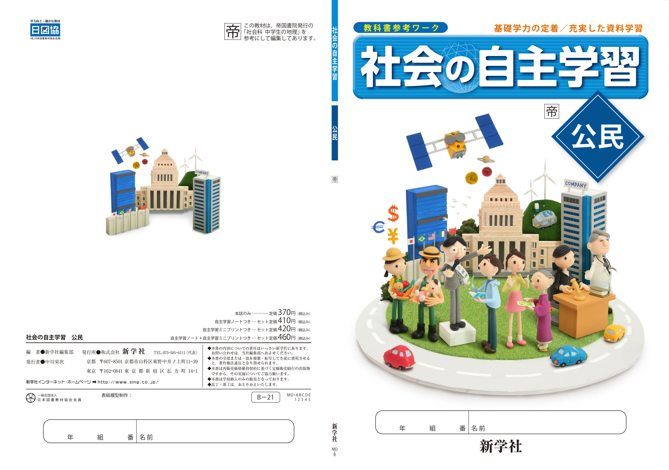 中学生向け社会科教材『社会の自主学習 公民』(新学社)の表紙用クレイアートビジュアルを制作しました。ウォルナッツ・クレイワークスタジオが企画デザインから立体造形、撮影、照明、DTP仕上げまで一貫して担当。 「社会の仕組みとつながりを一目で理解できる構成」をテーマに、政治・経済・国際・科学・暮らしといった多領域を一つの世界に凝縮した“公民の決定版”といえるビジュアルデザインとなっています。
