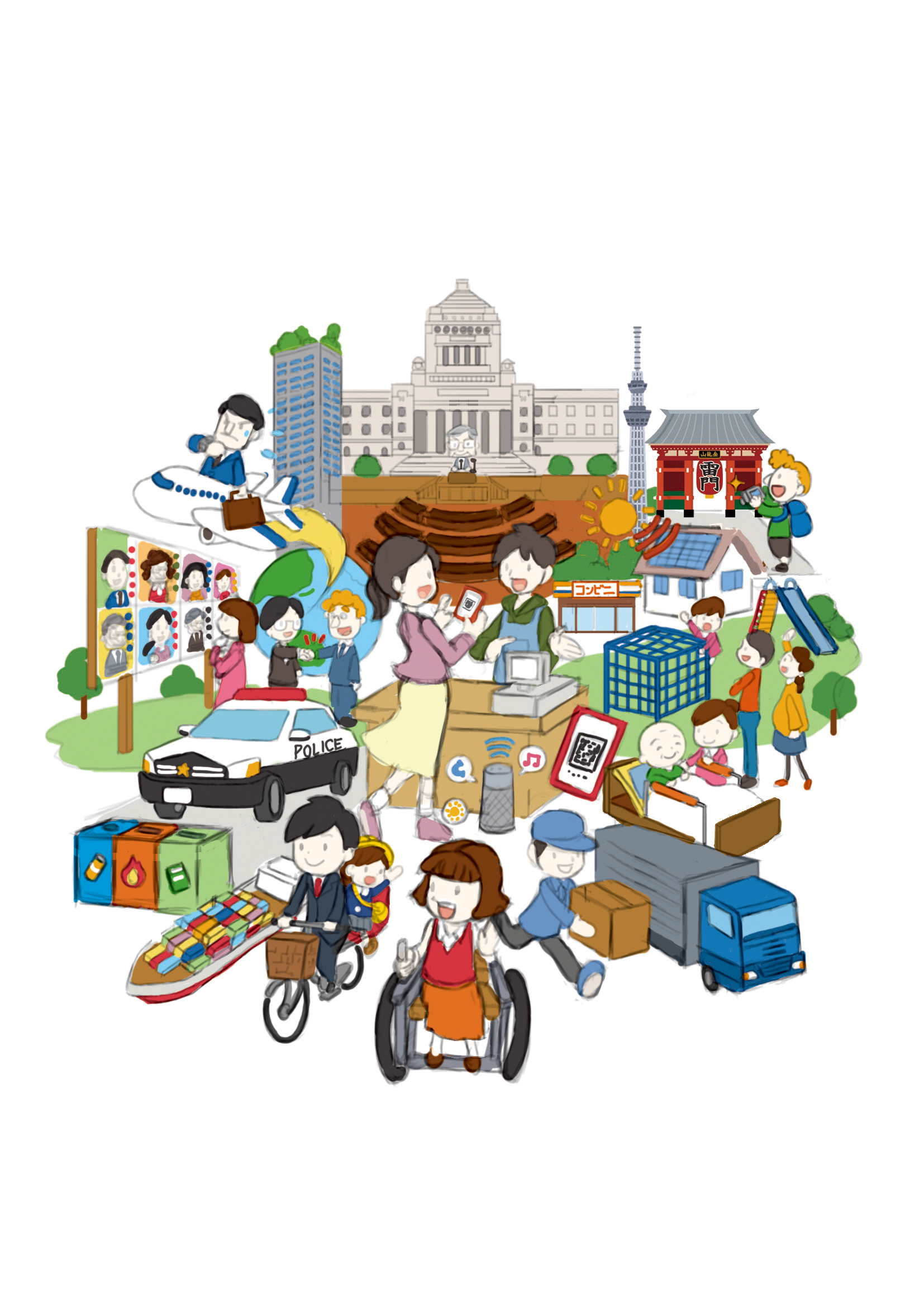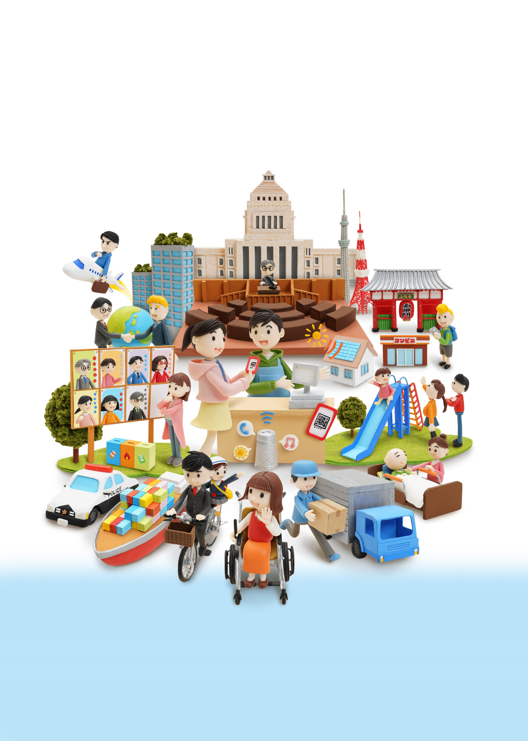 登場人物・建築物・乗り物・機器・社会的シーンまですべてを樹脂粘土・軽量粘土・スチロールボード・木材・プラスチック素材で手づくり。国会議事堂や最高裁判所は、スチロールボードをベースに細部まで彫刻し、窓や柱、屋根の陰影までリアルに再現。社会のインフラを象徴するパトカー・バス・貨物船・飛行機・太陽光パネル・AIロボットなども全て手づくりの粘土造形で制作。特に運送会社のトラックやAmazonの配送パッケージ、スマート家電、車椅子の利用者など、多様な社会の姿を「リアルとディフォルメの融合」というスタイルでデザイン。粘土による丸みのある造形で親しみやすさを保ちながらも、社会の機能やテクノロジーを精密に表現しています。介護・子育て・エコエネルギーといったテーマも取り入れ、“人と社会が支え合う明るい未来像”を体感的に伝える、教育ビジュアルとして設計されました。