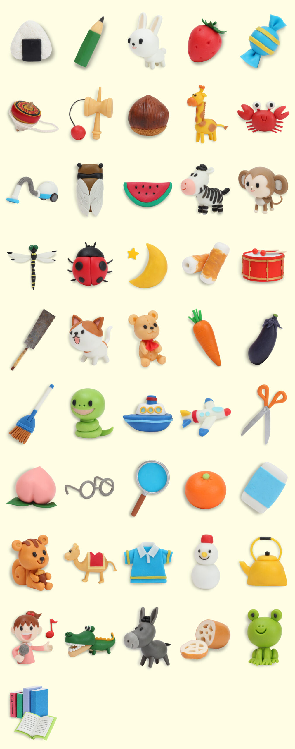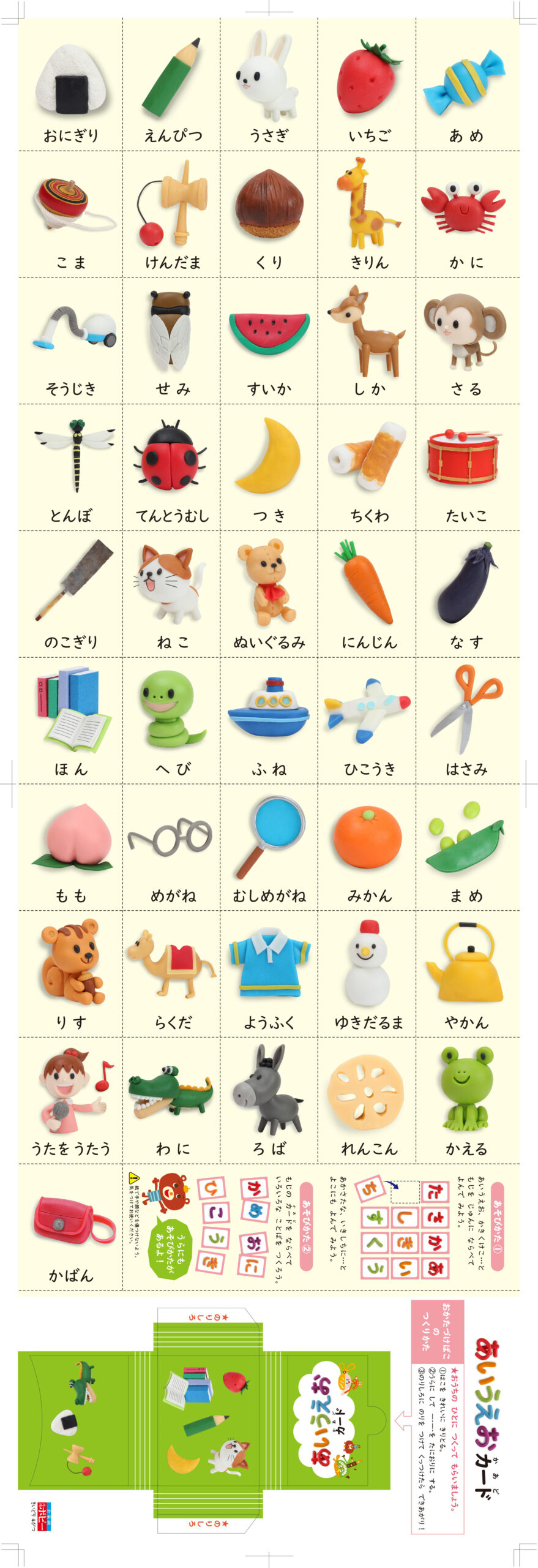 ひらがな一文字ごとに関連する動物・食べ物・日用品などを樹脂粘土で立体的に造形。「あ=あめ」「い=いちご」「う=うさぎ」「え=えんぴつ」「お=おにぎり」など、五十音すべてに親しみやすいモチーフを設定し、文字とものの関係性を直感的に学べるよう設計されています。「あいうえお」から「わをん」まで、各段ごとにテーマ性を持たせ、 「かきくけこ」=かに/きりん/くり/けんだま/こま、 「さしすせそ」=さる/しか/すいか/せみ/そうじき、 「たちつてと」=たいこ/ちくわ/つき/てんとうむし/とんぼ、 といったように語彙・視覚・造形の三要素で学びを支える構成となっています。カードの上では、ひらがな文字そのものもすべて粘土で立体制作。書き順を覚えやすくするために、実際の筆順どおりに粘土の重なりを設計し、手でなぞるように学べる教材デザインを実現しています。カラフルな配色と柔らかな形状は、幼児が“見ているだけで楽しい”と感じられるよう工夫されています。