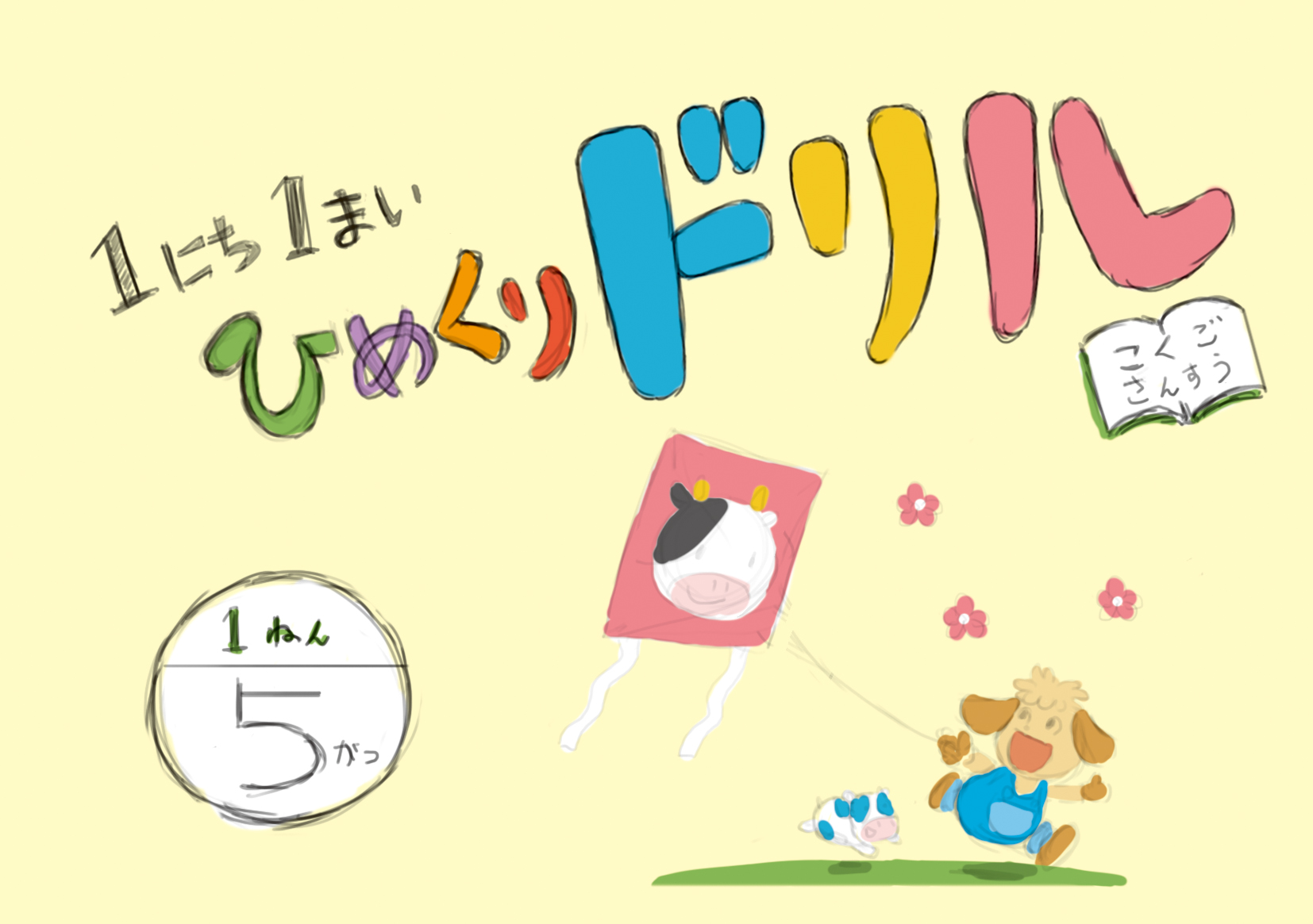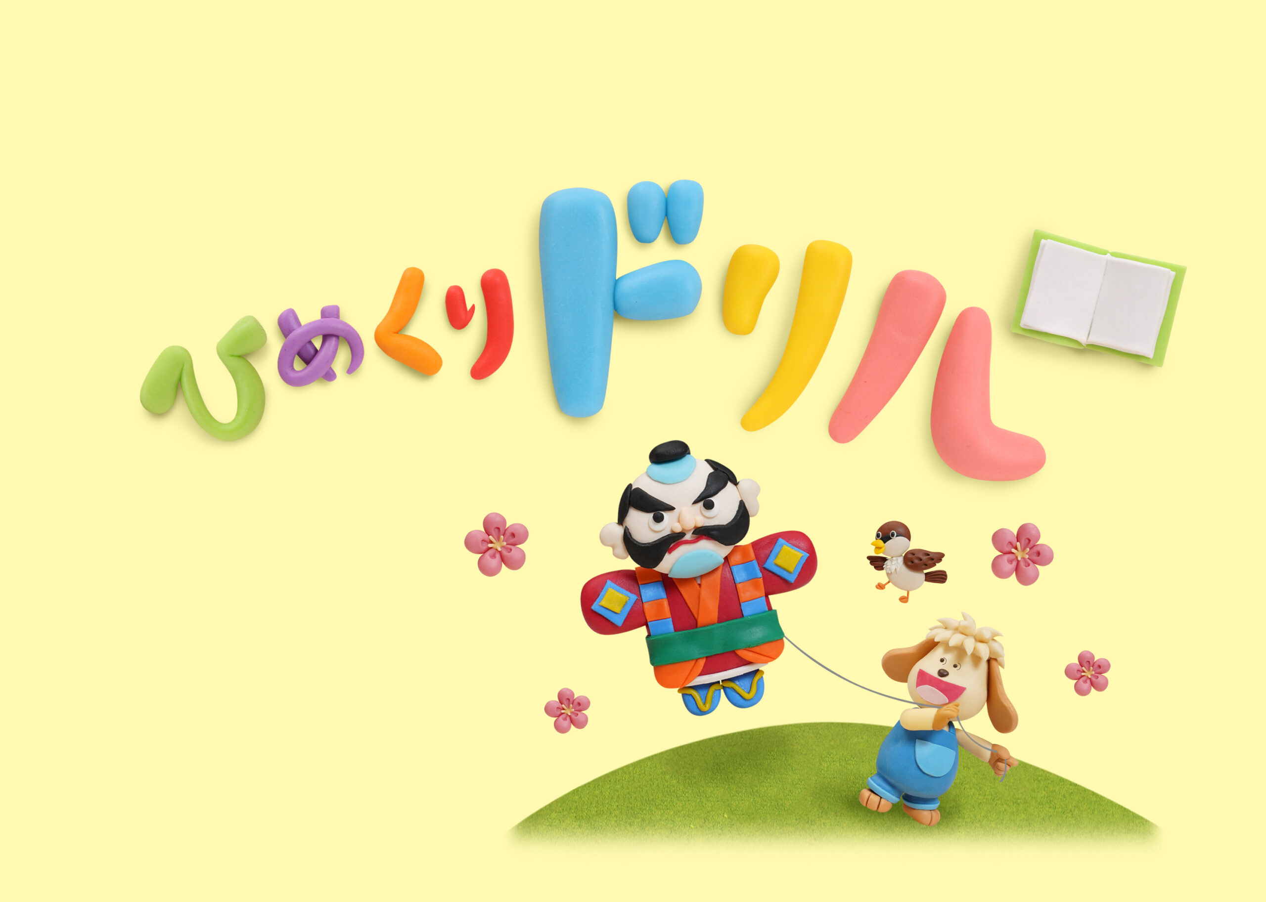 すべてのキャラクター・背景・小物を樹脂粘土・軽量粘土・スチロールボードなどを用いて手づくり。テンテンの服や凧の糸、梅の花びらなど、数ミリ単位の要素まで緻密に成形されています。また、「ひめくりドリル」のタイトル文字もカラフルな樹脂粘土で立体制作。書き順どおりに粘土を重ねて構成することで、学習教材としてのテーマ性をデザインの中に融合しています。誌面全体にリズムと立体感を与え、ページをめくる楽しさが自然に伝わるビジュアル構成になっています。