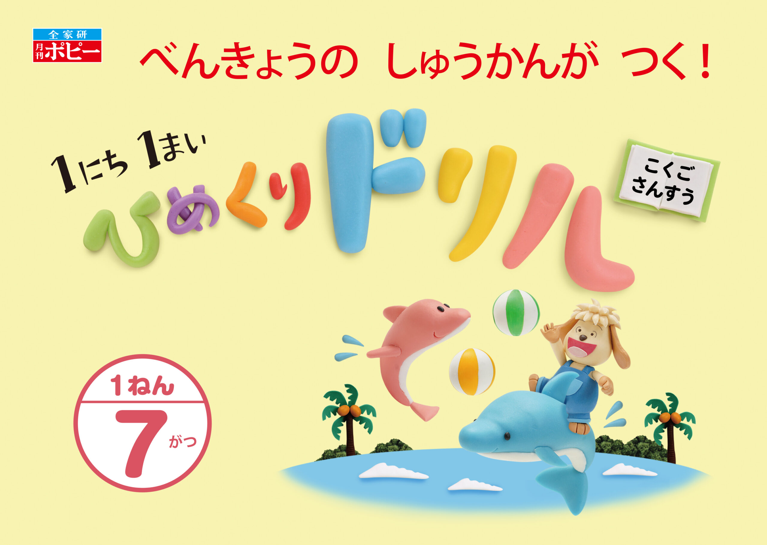 株式会社新学社さま発行の小学1年生向け教材『小学ポピー 1にち1まい ひめくりドリル/こくご・さんすう 7月号』の表紙ビジュアルを制作しました。ウォルナッツ・クレイワークスタジオが企画デザインから立体造形、撮影、照明、DTP制作までを一貫して担当。7月号では“海遊び”をテーマに、テンテンがイルカたちと一緒に夏の海で遊ぶ様子を描いた、明るく開放感のあるクレイアートビジュアルです。