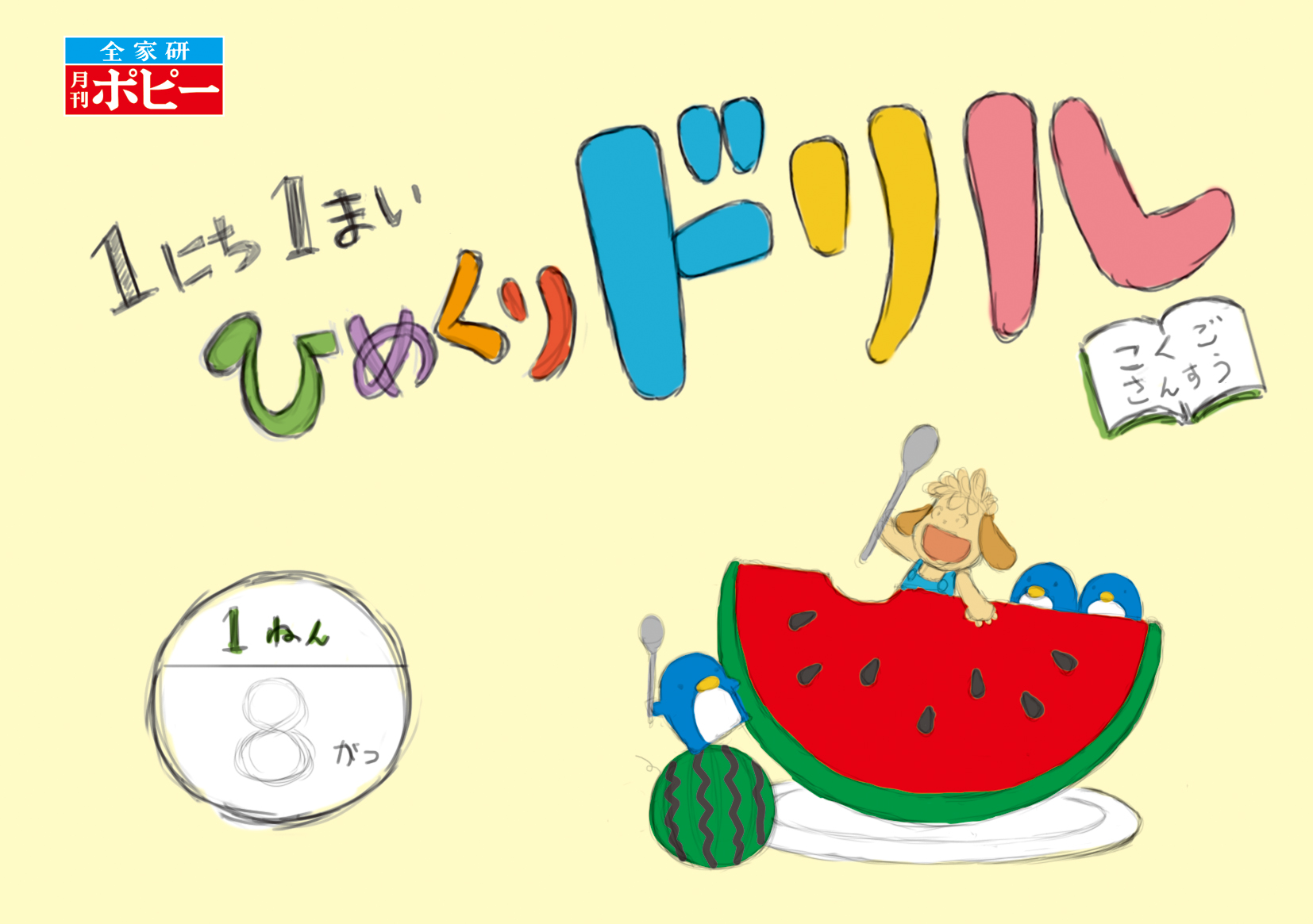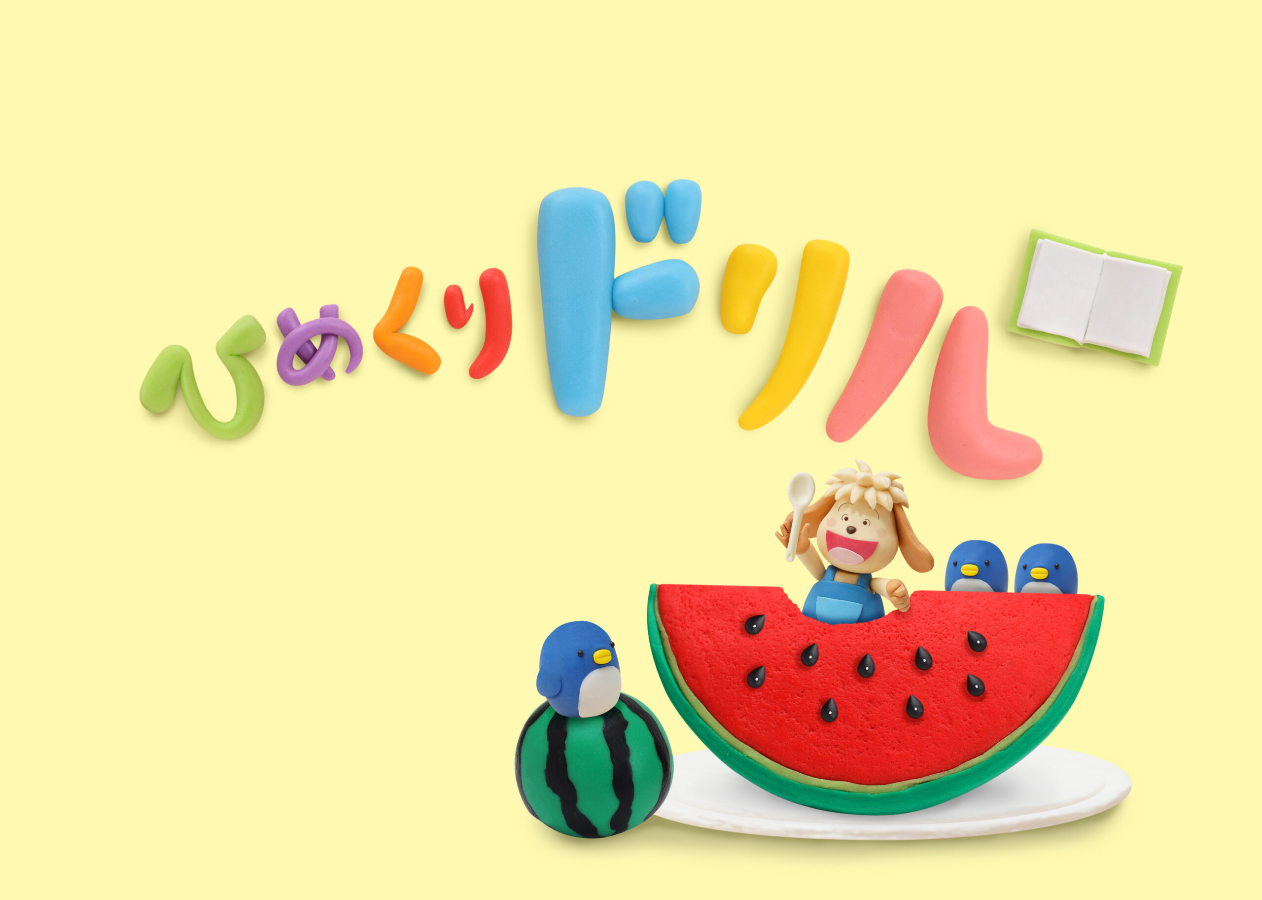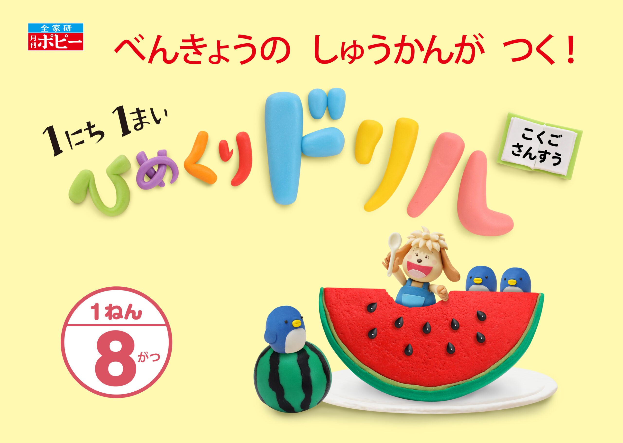 株式会社新学社さま発行の小学1年生向け教材『小学ポピー 1にち1まい ひめくりドリル/こくご・さんすう 8月号』の表紙ビジュアルを制作しました。ウォルナッツ・クレイワークスタジオが企画デザインから立体造形、撮影、照明、DTP制作までを一貫して担当。8月号では“スイカ”をテーマに、テンテンとペンギンたちが夏のひとときを楽しむ様子を描いた、色鮮やかで季節感あふれるクレイアートビジュアルです。