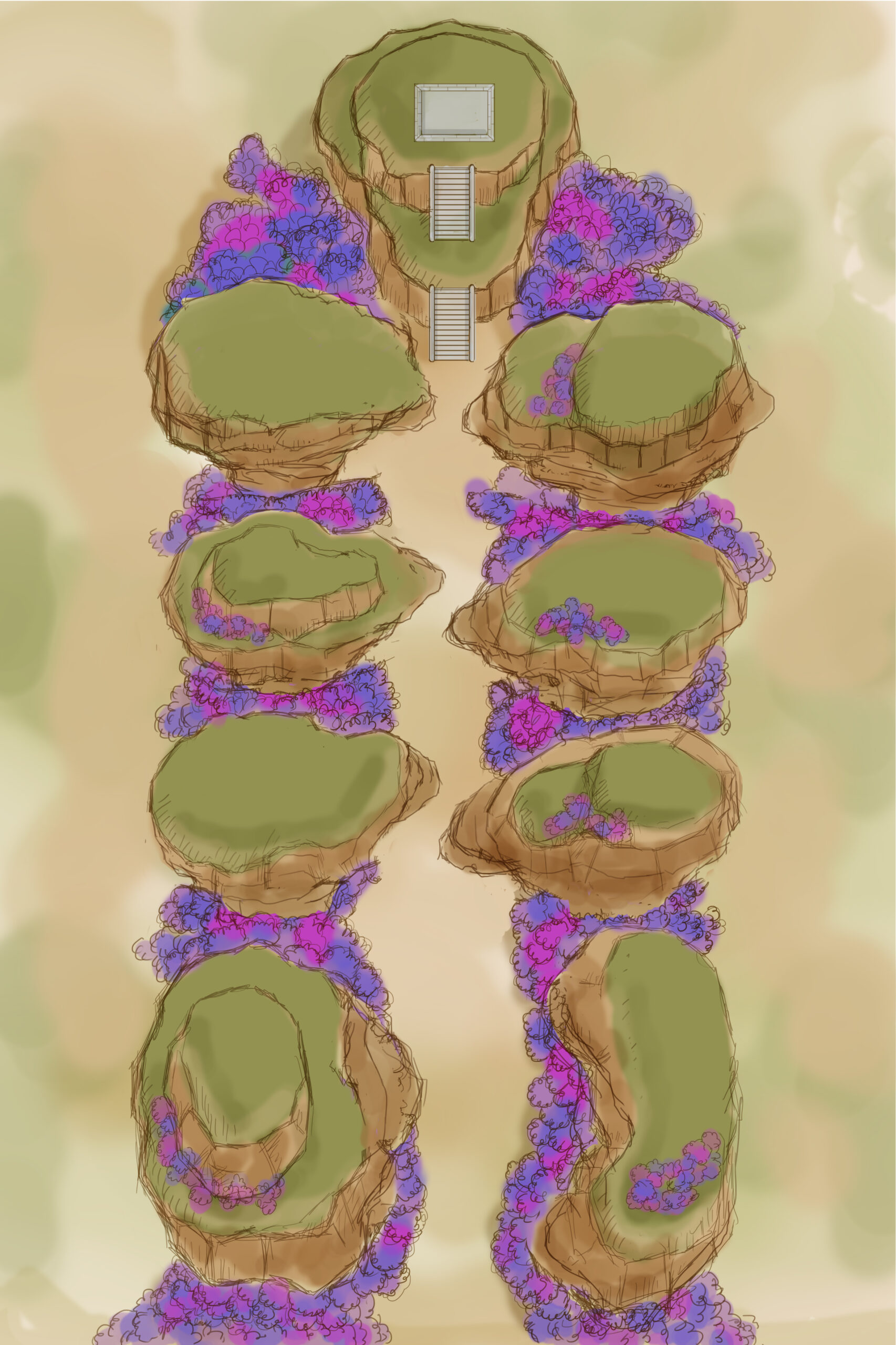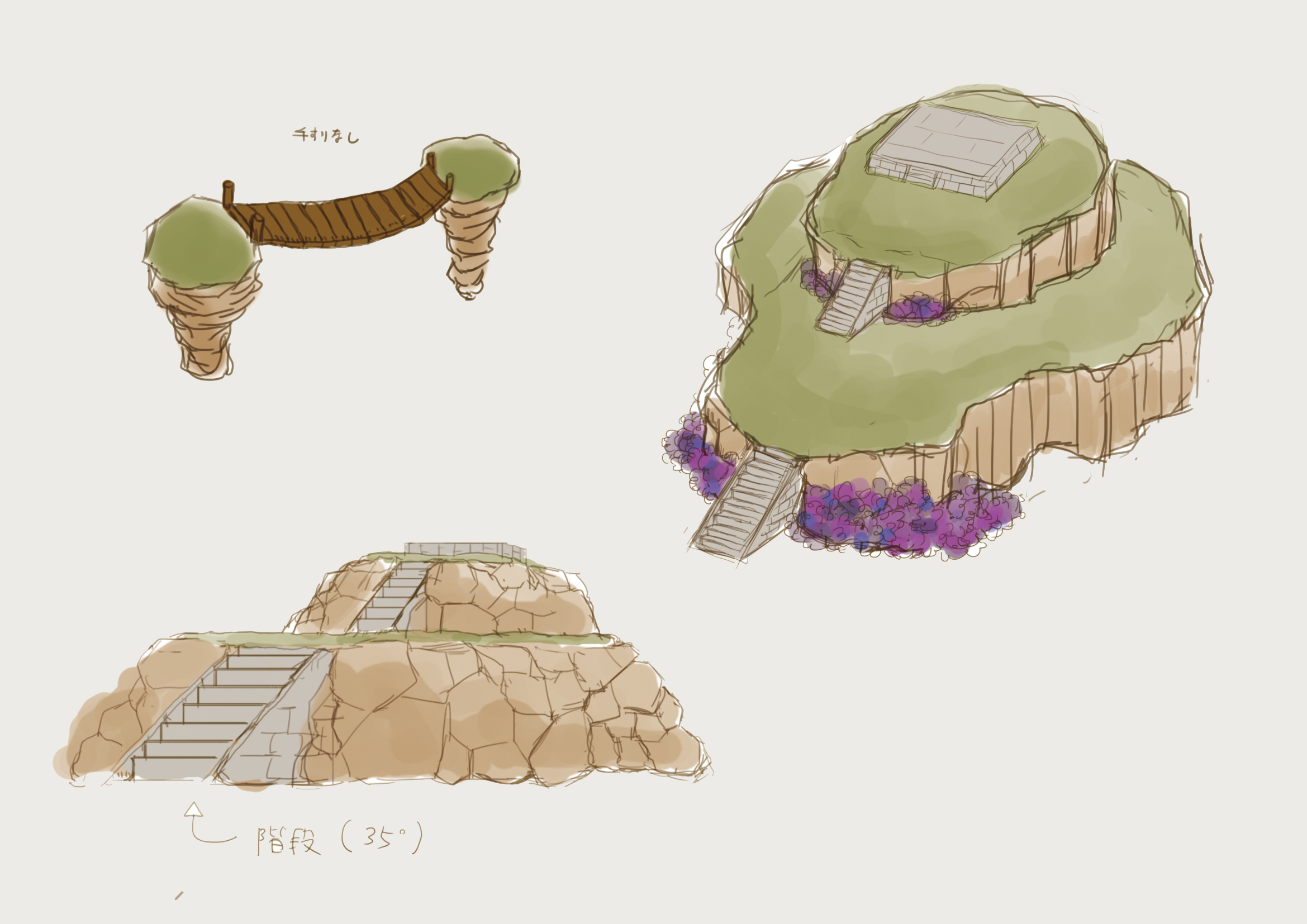 岩場の上へと続く石階段は、古代文明の遺跡を思わせる造形を意識しました。ある程度の規則性を持たせながらも、機械的に整った形にはせず、人の手で削り、積み上げられたような不均一さを加えています。段差の角には削れや欠けを入れ、表面にはヒビや汚しを施すことで、長い年月を経た石造物としての存在感を表現しました。