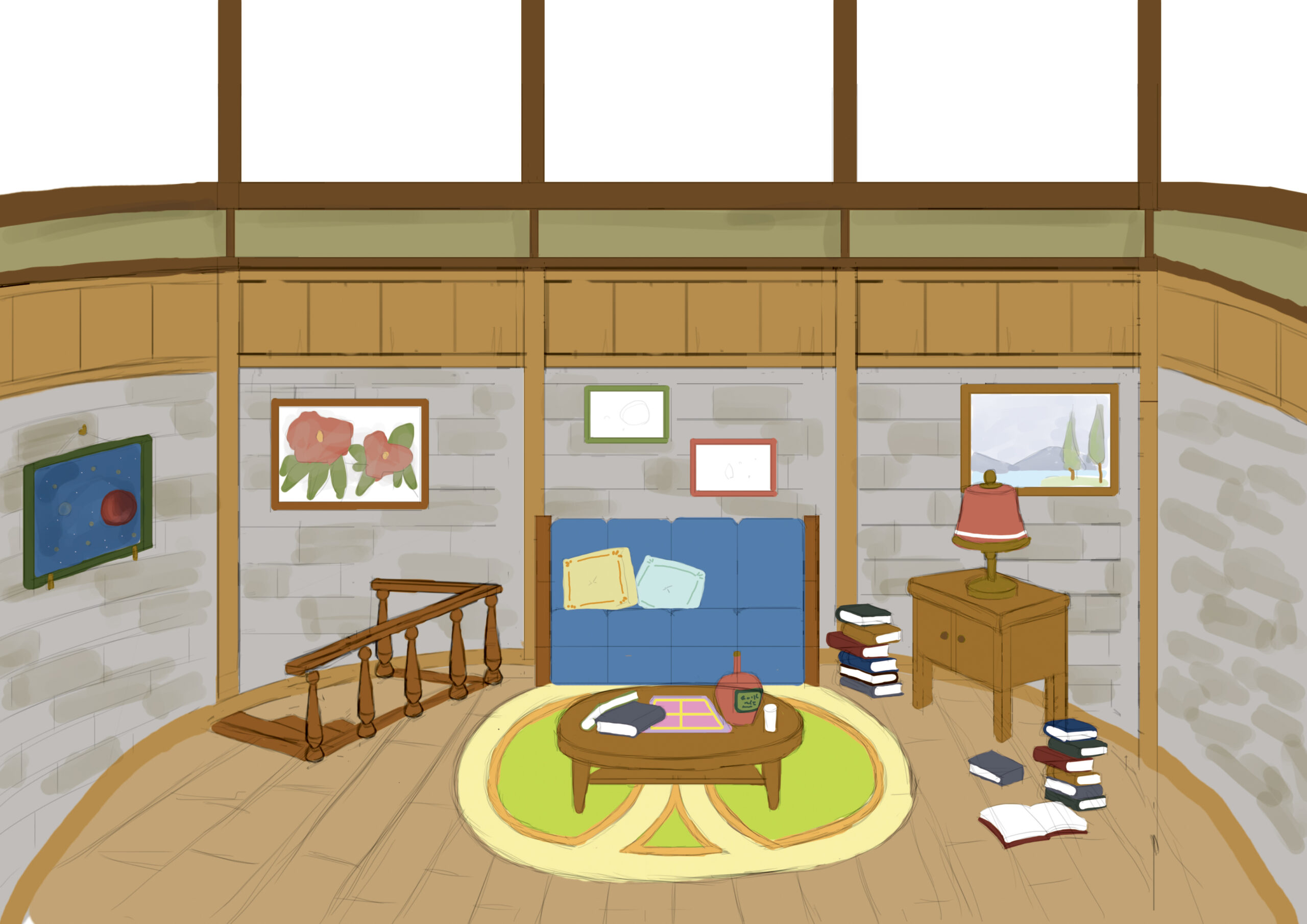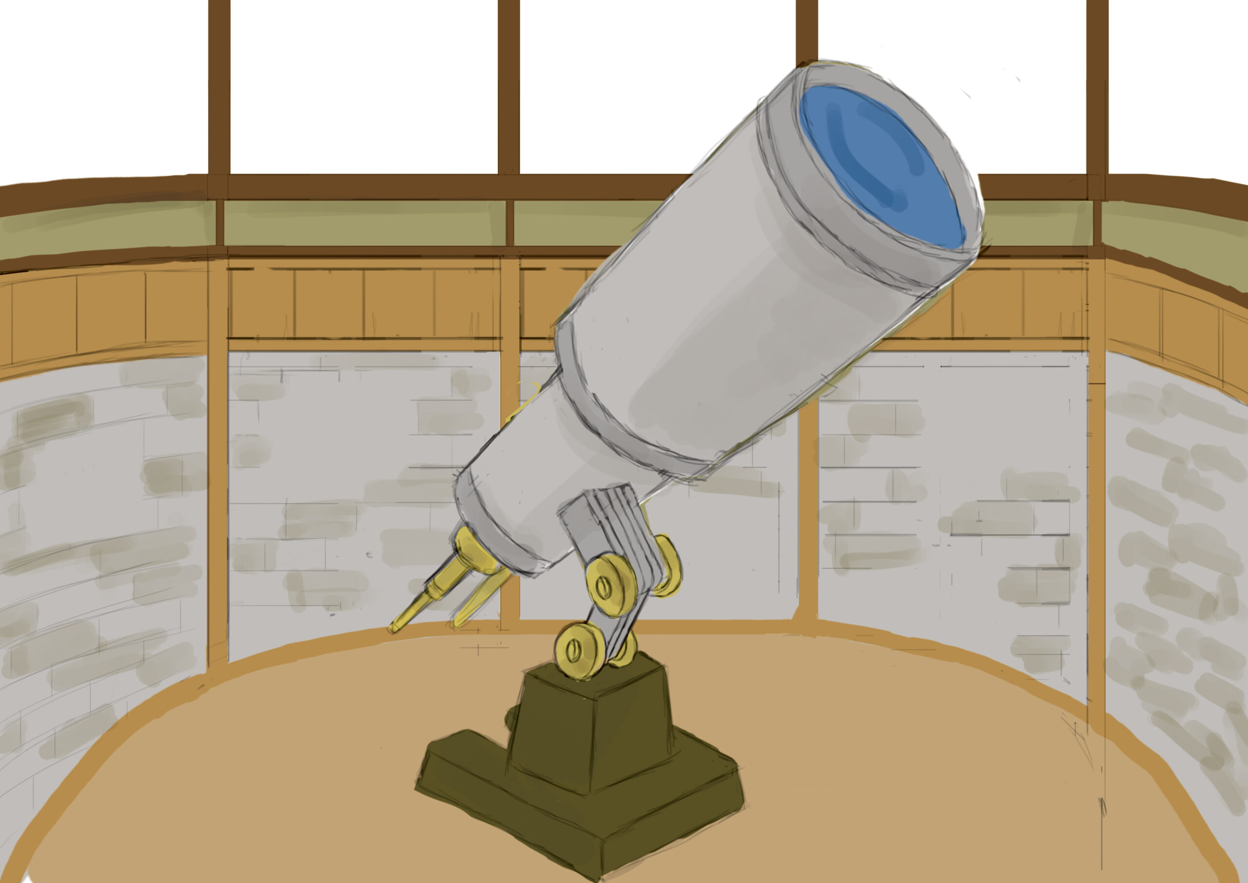 色彩設計では、アンティークな室内空間らしい落ち着いた木部の色味を基調としながら、クッションや絵画、天井画、望遠鏡のレンズにアクセントとなる色彩を加えています。特にレンズの濃い青や、壁面の絵画、天井装飾の彩色によって、静かな研究室の中に幻想性と知的な豊かさが感じられるよう調整しました。全体は派手になりすぎず、研究室らしい落ち着きを保ちながら、細部を見るほど情報が増えていく空間として設計しています。