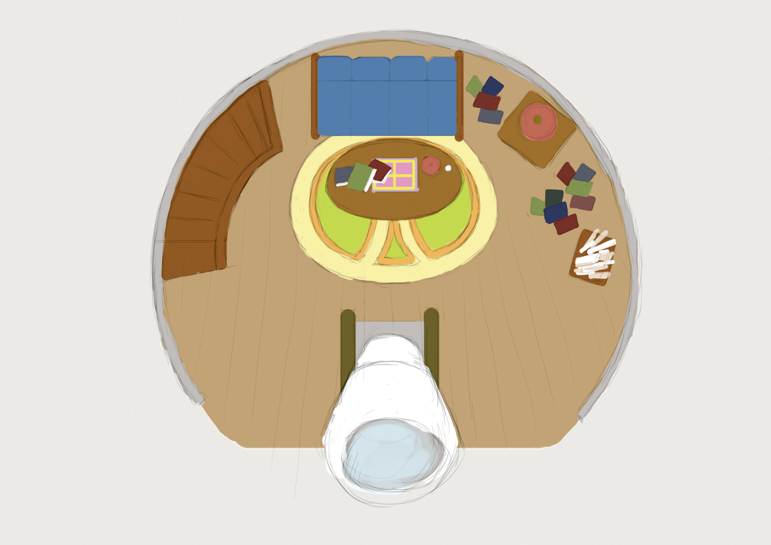 研究の合間に体を休めるためのソファーには色違いのクッションを置き、壁には自然物や世界の風景を描いた絵画を飾ることで、学術的な空間の中にも個人の趣味や感性が感じられる室内に仕上げました。床には散らばった本や研究資料の設計図が無造作に置かれ、日々思索と作業が繰り返されている部屋としての空気感を表現しています。