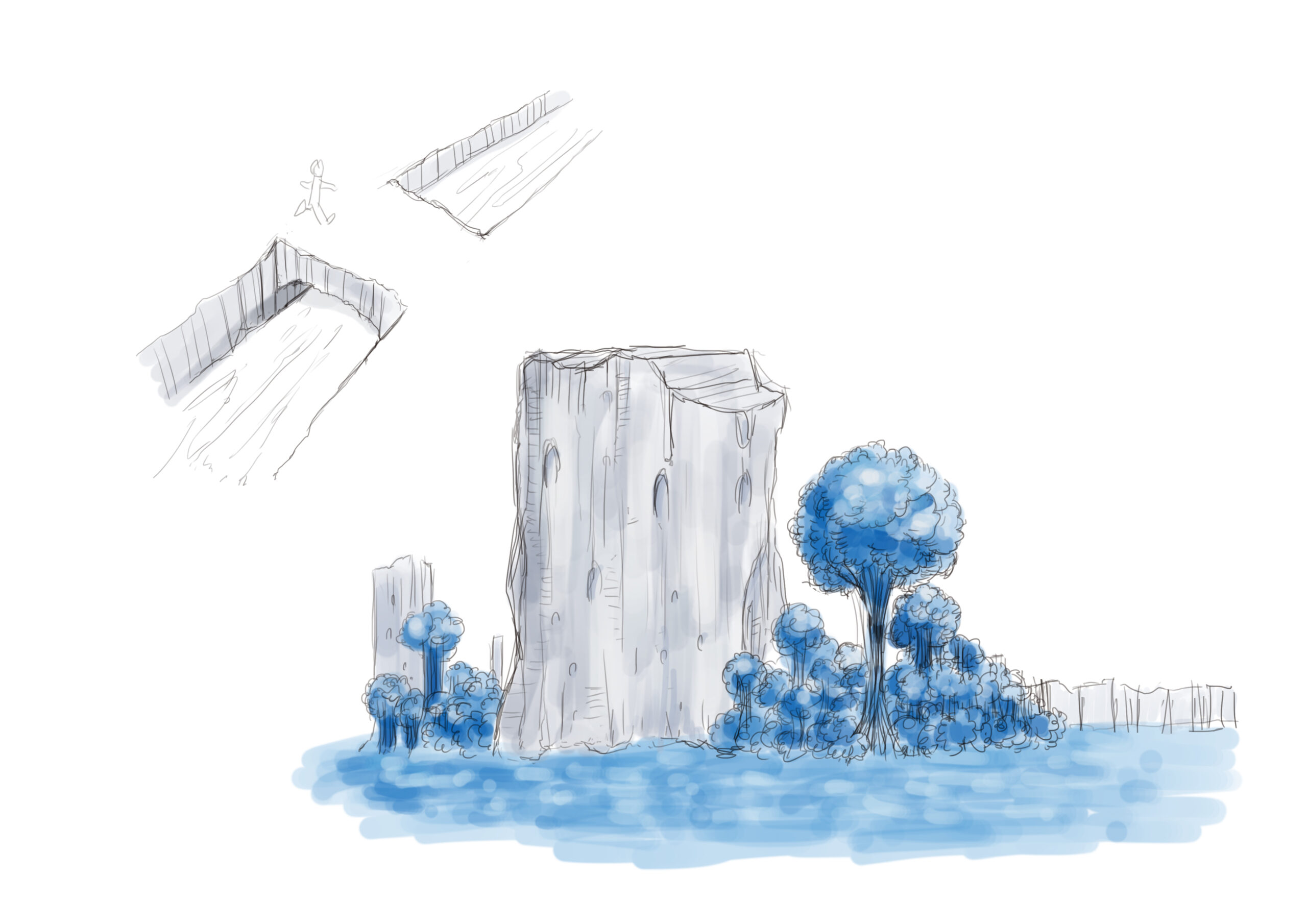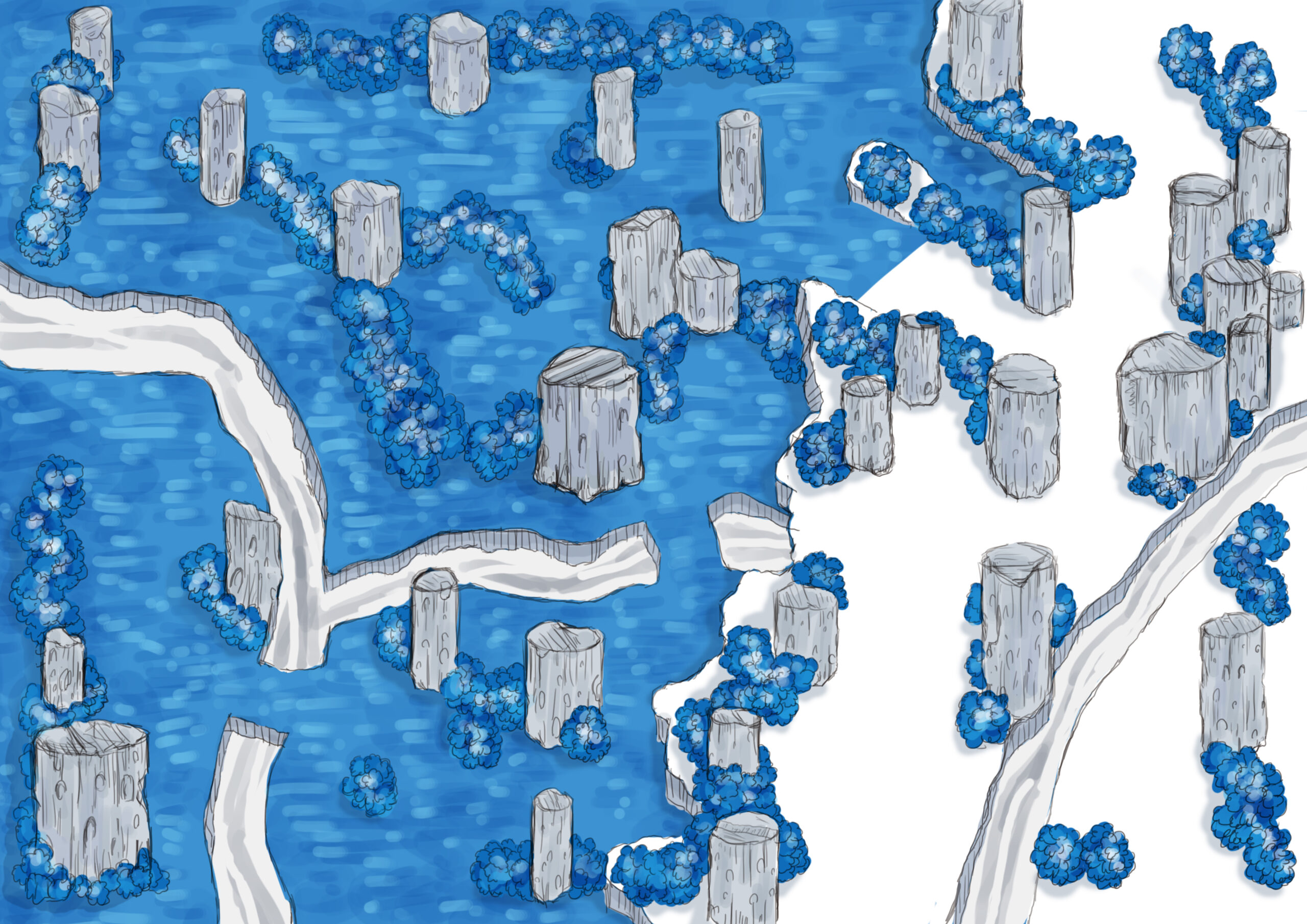 色彩設計では、石化した白い地表に対して、鮮やかな青を強く印象づける構成としています。白と青のコントラストによって、静けさと不穏さ、無機質さと増殖する生命感を同時に成立させています。さらに、単一の青ではなく、濃淡や広がり方に差を持たせることで、侵食の進行度や密度の違いが見えるよう調整しました。