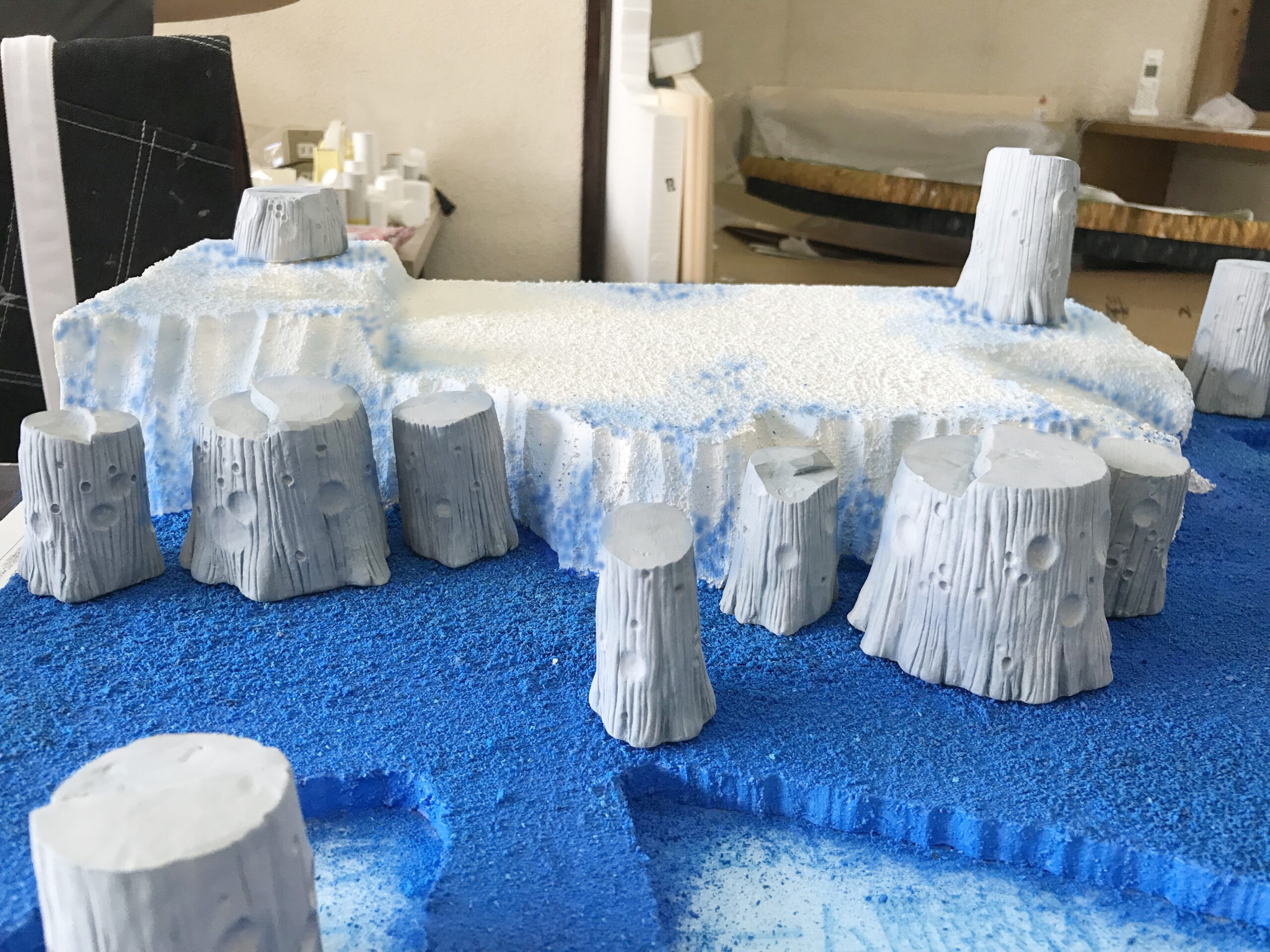 ・青い侵食表現:アクリルガッシュを練り込んだ軽量粘土の粉末素材