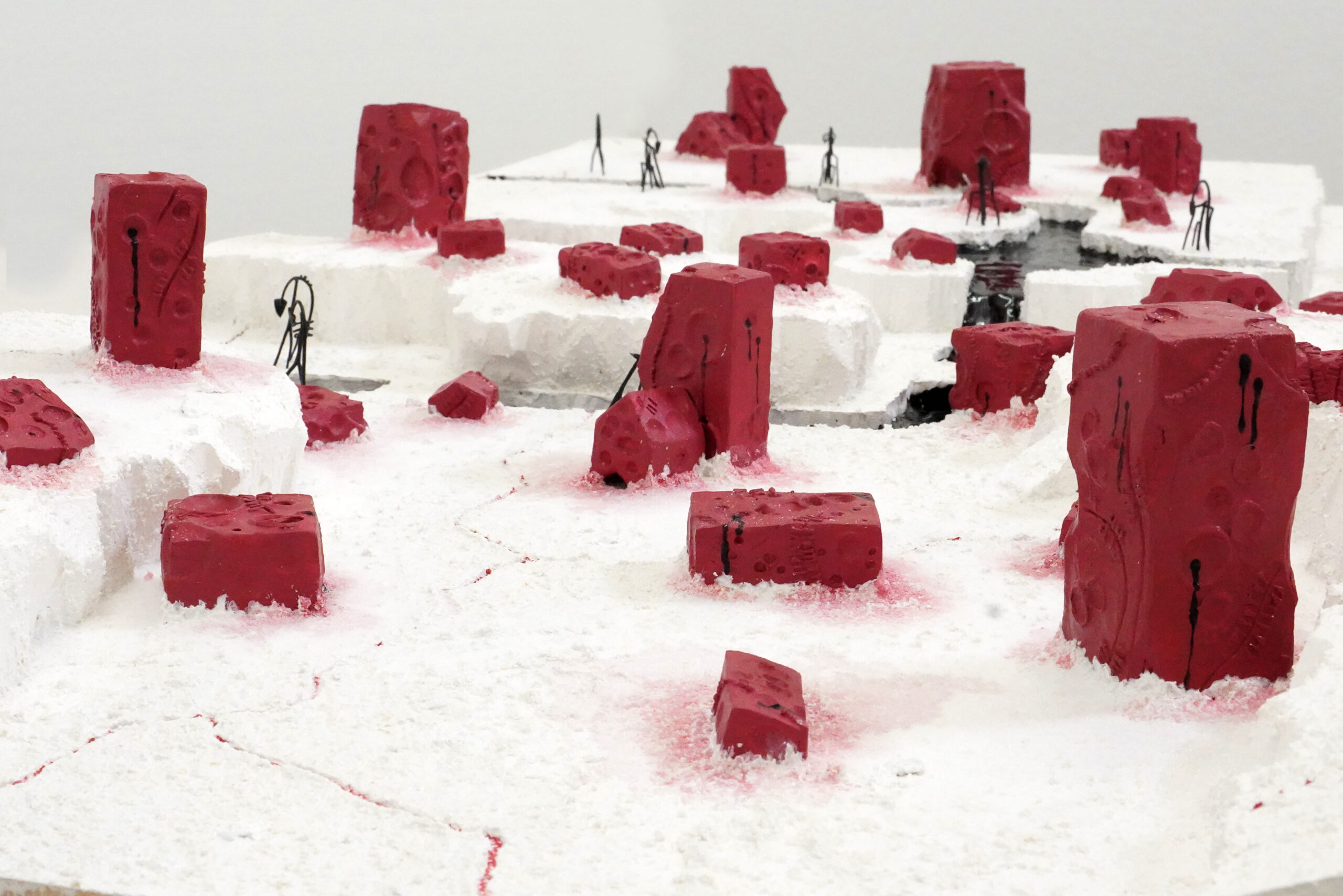 本作の象徴ともいえる赤いひび割れは、まず地表にアクリルガッシュで赤を塗装し、その上から重曹、アクリルガッシュ、レジンサンドを混ぜ込んだペーストを粘土へらで少しずつ埋めるように重ねて制作しています。表面を完全には覆わず、塗り残した隙間から赤がのぞく構造とすることで、大地の内部に血管のような赤い脈が張り巡らされているような印象を表現しました。単なる表面の模様ではなく、地中から何かが滲み出しているような不穏な立体感が生まれています。
