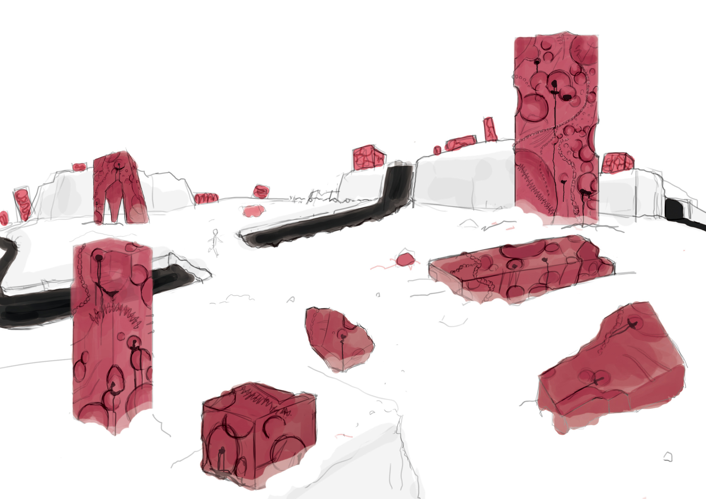 色彩設計では、白・赤・黒の3色を軸に、混沌の世界観を強く印象づけています。白い大地は静止した無機質な地表、赤は内部からにじみ出る異常な脈動、黒は死と粘度を感じる不穏な存在として機能しています。色数を絞ることで、一つひとつの造形要素がより強く際立ち、ゲーム空間としての異様さが視覚的に伝わるように構成しました。