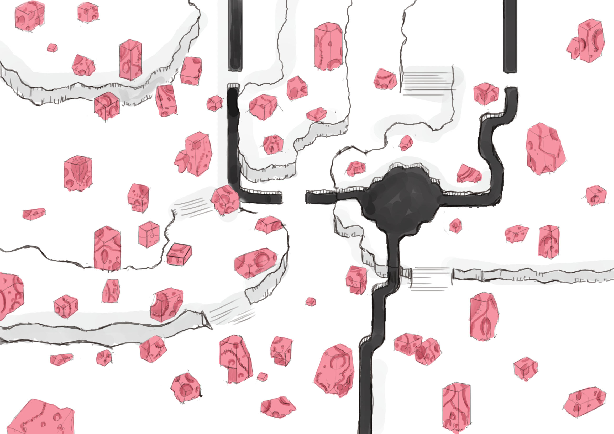 そこに、行く手を阻むように突き出す赤い巨石、タールのように重く流れる黒い川、そしてかろうじて生命を感じさせる黒い植物を配置することで、世界全体に張りつめた緊張感を持たせました。生命が絶えたように見えながら、別の異質な何かが脈動している――そんな矛盾した印象を、色彩と造形の両方で表現しています。